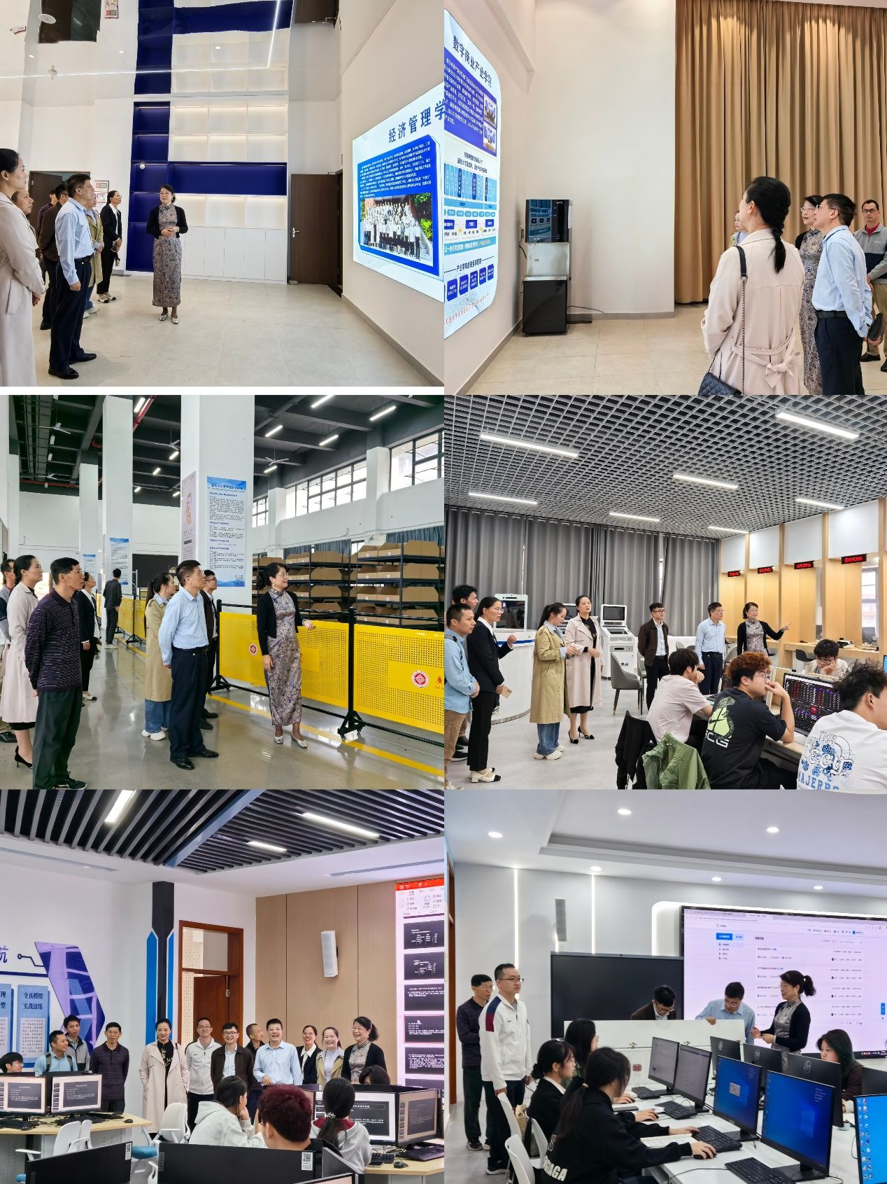 在赖文燕院长的陪同下,杨建平一行实地参观了学院的技能大师工作室、智慧物流实训基地以及智慧金融中心等实训设施。参观过程中,赖文燕院长详细介绍了各实训平台的教学功能、设备运行及课程融合情况。杨建平对学院先进的实训设施、完善的实践教学体系以及产教融合的育人模式给予了高度评价。