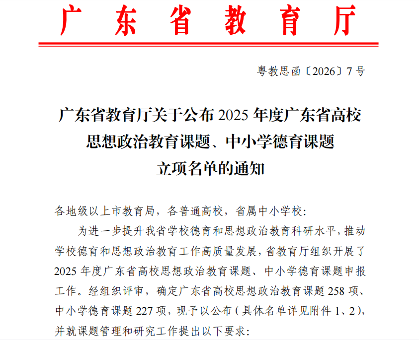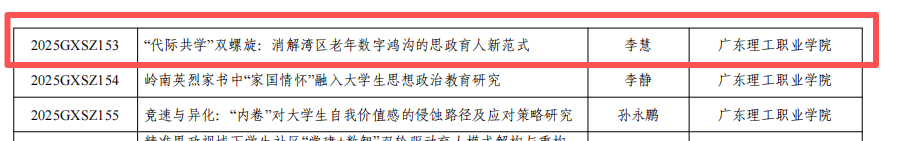 近日,广东省教育厅正式公布 2025 年度广东省高校思想政治教育课题立项名单,经济管理学院李慧老师申报的课题《“代际共学” 双螺旋:消解湾区老年数字鸿沟的思政育人新范式》(课题编号:2025GXSZ153)成功立项。此次立项是学院立足学科优势、深化跨学科协同创新的重要成果,也是学院在思想政治教育科研领域的又一突破。