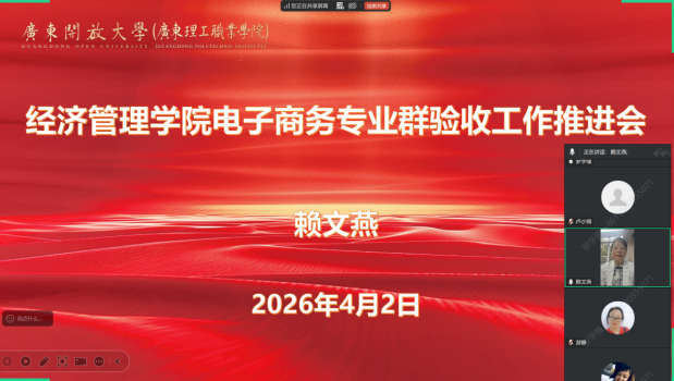 4日2日,经济管理学院召开电子商务专业群验收工作汇报及研讨会,检查验收筹备进展、梳理现存问题、明确冲刺方向,推动专业群建设提质增效。会议由罗学强副院长主持,赖文燕院长及电子商务专业群全体教师参加会议。