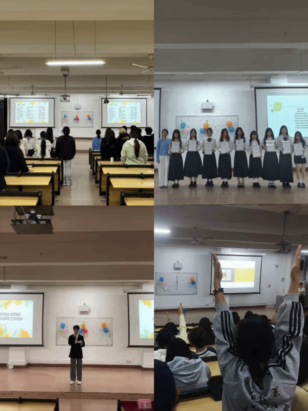 首先,新任干部依次上台分享任职感想,23 级副站长全面回顾了过去一学年的工作成果,新任副站长则详细公布了 2025-2026 学年的工作计划。随后,聘任与表彰仪式顺利举行,优秀心理委员与骨干干事荣获荣誉表彰;现场还同步开展趣味心理游戏互动,让大家在轻松氛围中增进交流、凝聚共识。最后,指导老师林姿默老师对心阳驿站全体同学的辛勤付出致以衷心感谢,肯定大家以真诚之心为心阳驿站注入了温暖力量;同时,向长期以来关心、支持驿站建设的各位老师致以最诚挚的谢意。展望未来,林老师强调,心阳驿站需持续深化“一站式”心理健康服务功能,进一步发挥心理健康教育工作的育人实效,为师生提供更专业、更精准、更暖心的心理支持与服务,携手共建阳光健康、和谐友爱的校园氛围。